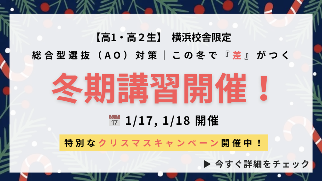 横浜校舎では、冬期講習への参加をご検討中の方を対象に、総合型選抜についてご相談いただける無料個別相談会や、1コマ分の授業を体験できる無料体験受講を実施しています!
