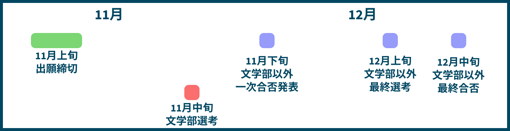 学校推薦型選抜(公募制)の出願期間は11月初めのとても短い期間です。文学部は11月中頃、ほかの学部は12月初めに選考が終了します。